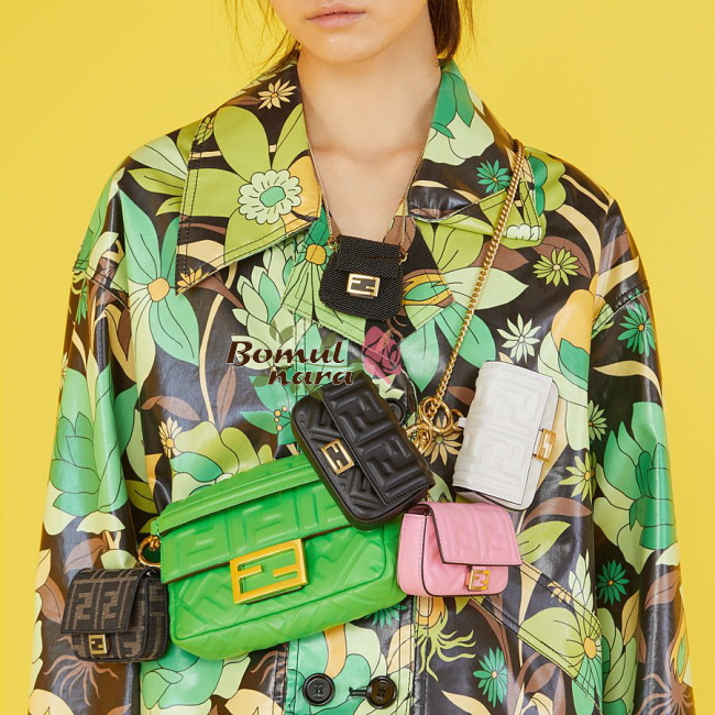 [스페셜오더]FENDI-7AR844 펜디 브라운/옐로우 바쉬 프린트 가죽 FF 나노 바게트 참 가격 : 220,000원