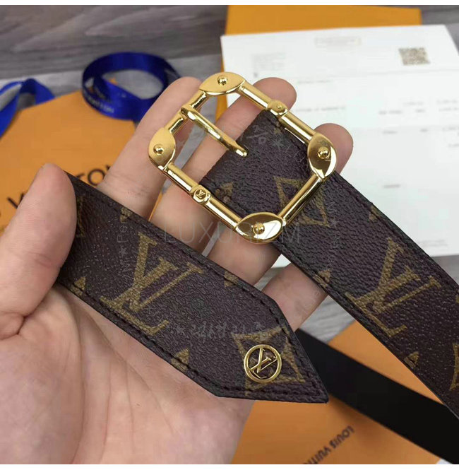 유서 깊은 LV트렁크를 오마주한 사각 버클과 모서리 디테일 금속 LV써클 엔드피스.
