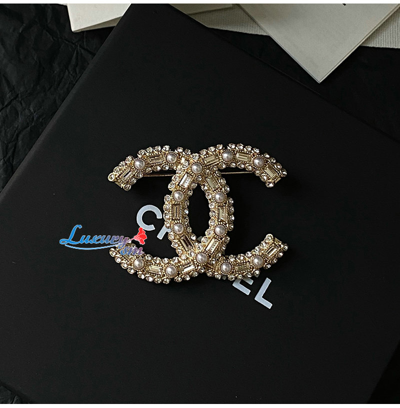 CHANEL-7097 샤넬 골드 크리스탈 진주 장식 CC 로고 브로치
