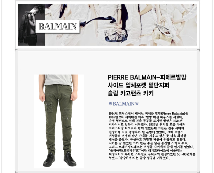●PIERRE BALMAIN 국내외 연예인들의 많은 사랑을 받고있는 프랑스의 대표적인 아이코닉 브랜드 BALMAIN의 세컨브랜드 디퓨전 라인입니다. 발망보다 부드럽고 편안한 맵시를 선사하면서 시크한 브랜드 정체성을 지니고있는 고가라인의 토탈브랜드입니다.