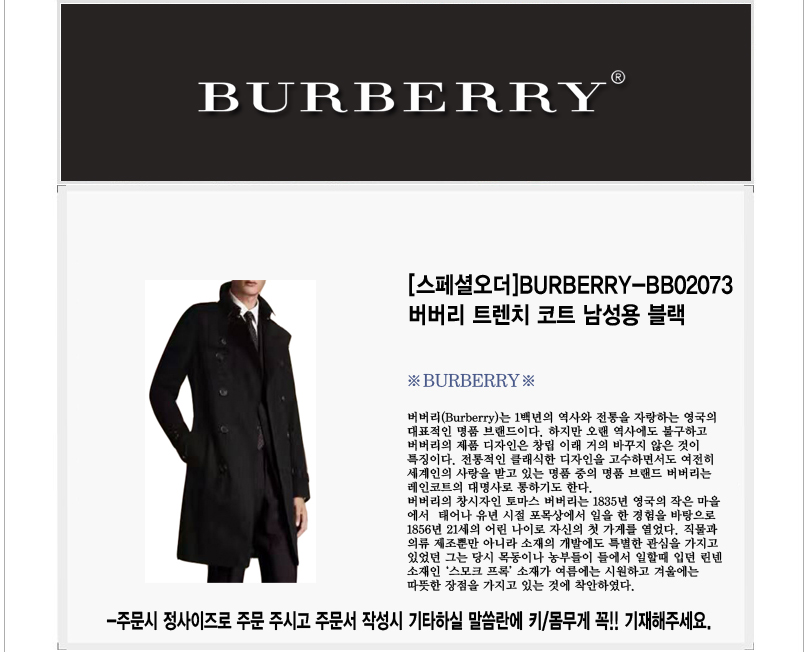 [스페셜오더]BURBERRY-BB02073 버버리 트렌치 롱 코트 남성용 블랙