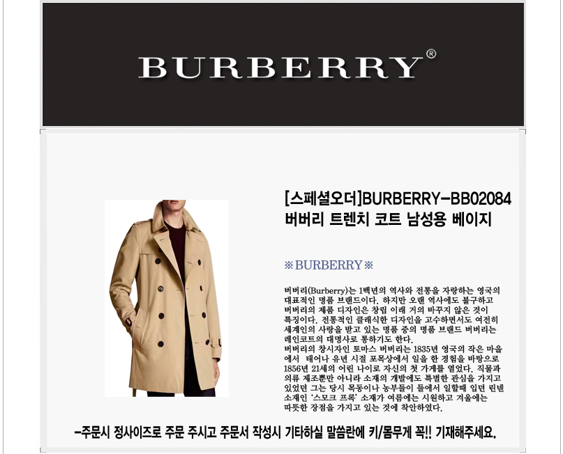 [스페셜오더]BURBERRY-BB02084 버버리 트렌치 코트 남성용 베이지