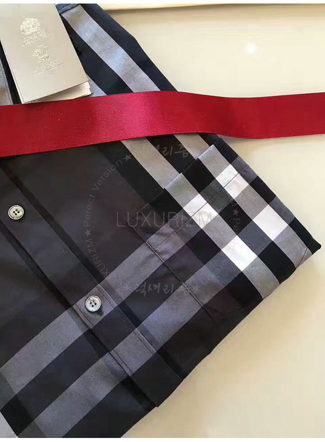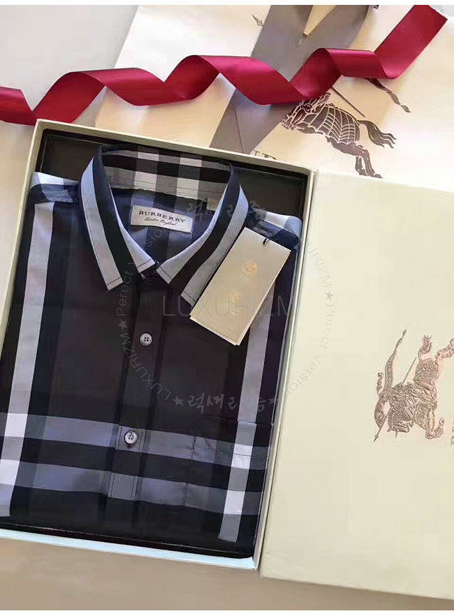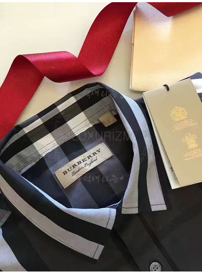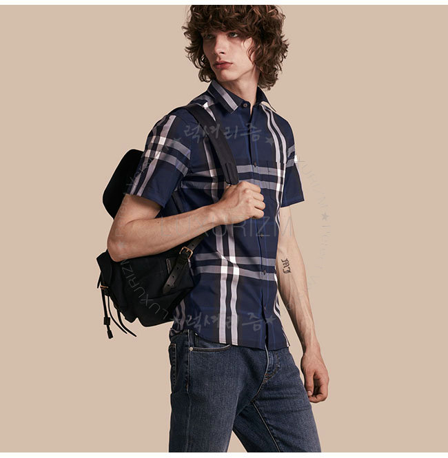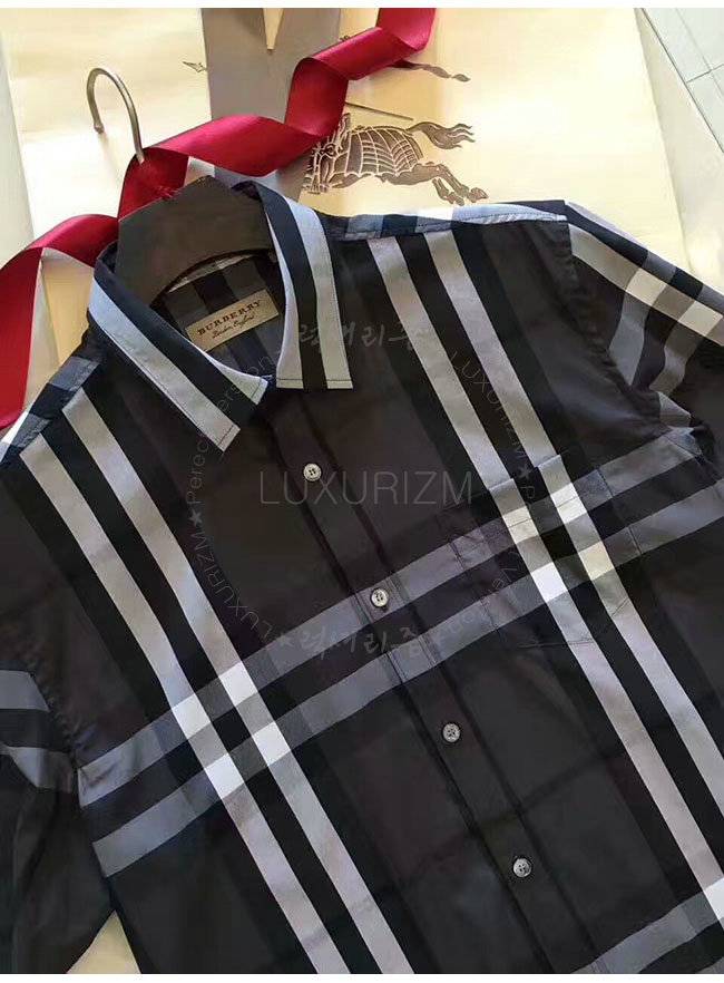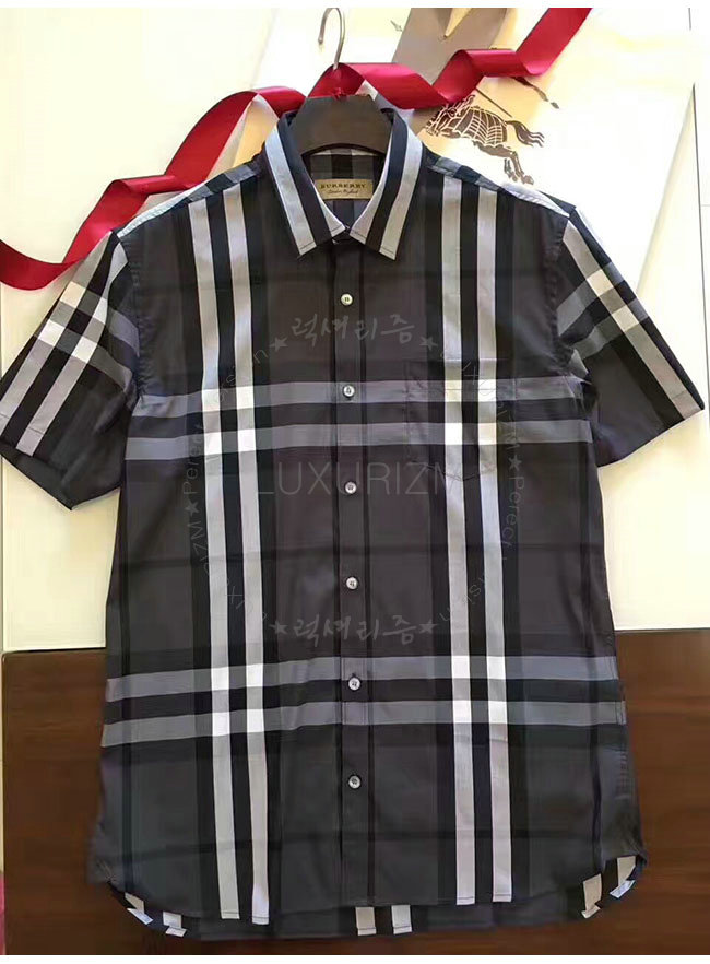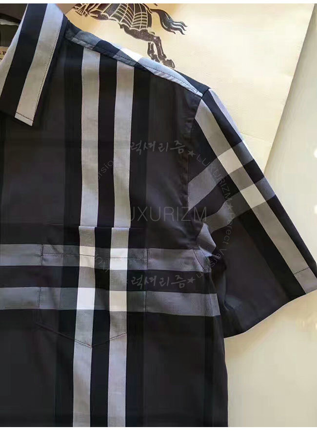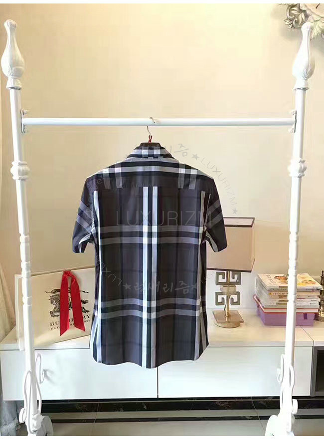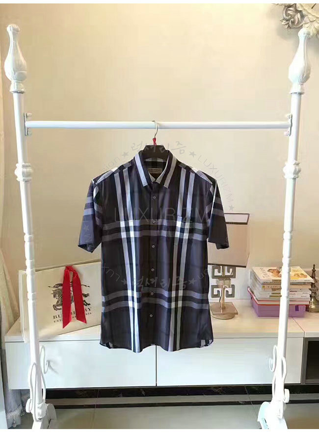 BURBERRYI-40039361 버버리 인디고 블루 쇼트 슬리브 체크 스트레치 코튼 셔츠 남성용