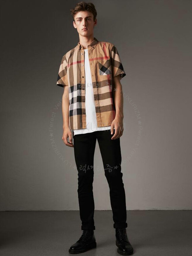 [스페셜오더]BURBERRY-40458371 버버리 쇼트 슬리브 체크 스트레치 차콜 코튼 블렌드 셔츠