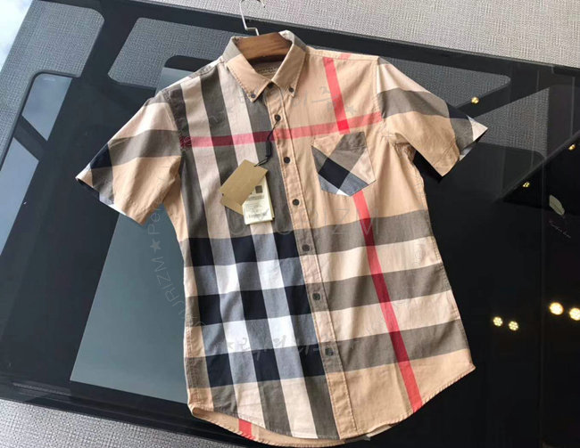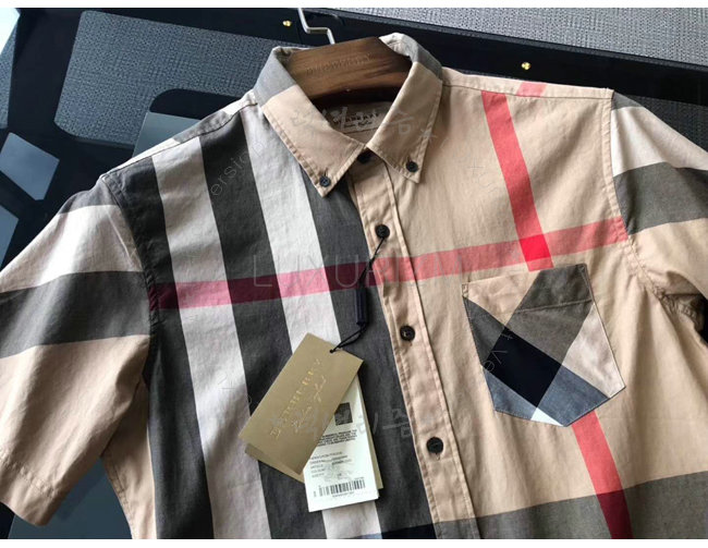 BURBERRY-40458371 버버리 쇼트 슬리브 체크 스트레치 카멜 코튼 블렌드 셔츠