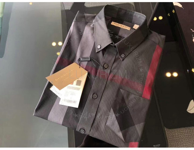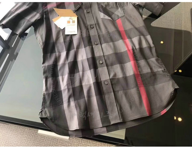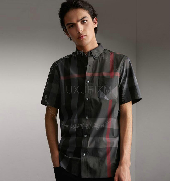 [스페셜오더]BURBERRY-40458371 버버리 쇼트 슬리브 체크 스트레치 차콜 코튼 블렌드 셔츠