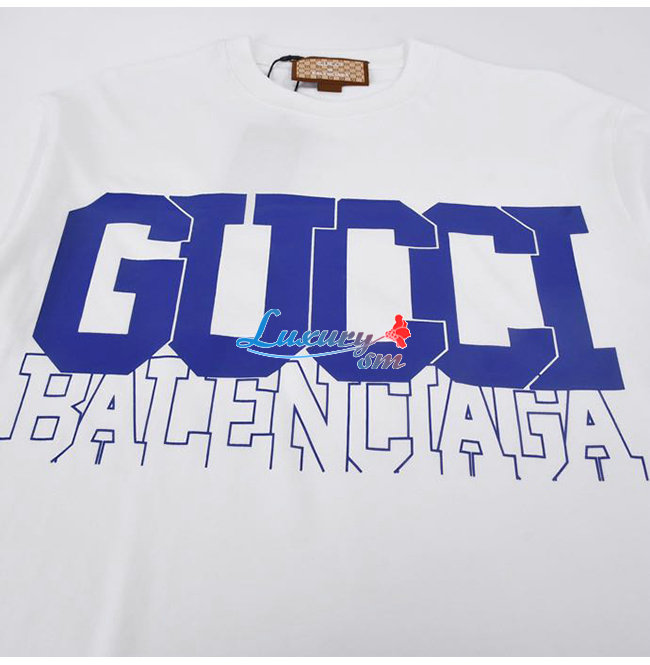 GUCC*-03089 구찌 화이트/블루 구찌 X 발렌시아가 콜라보 프린트 장식 티셔츠 남여공용