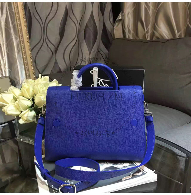 양면 플랩이 대담하고 개성적인 룩을 연출하는 블루 수송아지 가죽백.