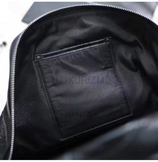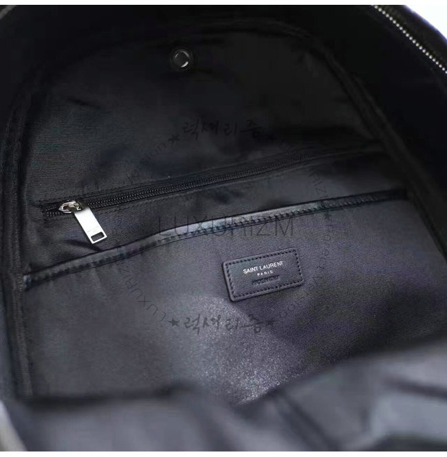-생로랑 시그니처가 양각으로 새겨진 뒷면의가죽패치 외부 지퍼 포켓의 가죽트리밍 디테일백팩.