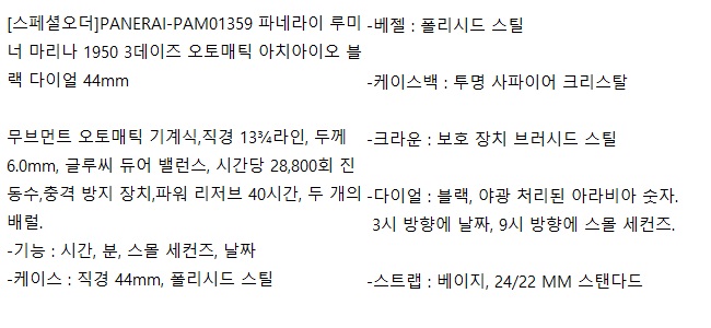 [스페셜오더]PANERAI-PAM01359 파네라이 루미너 마리나 1950 3데이즈 오토매틱 아치아이오 블랙 다이얼 44mm