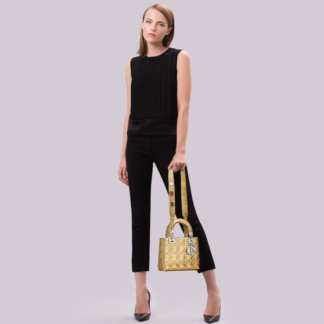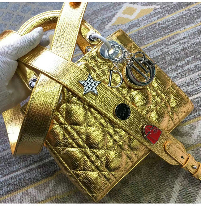스트랩을 맞춤 제작할 수 있는"Lady Dior" 골드 양가죽 백으로 까나쥬 스티칭 장식이 특징