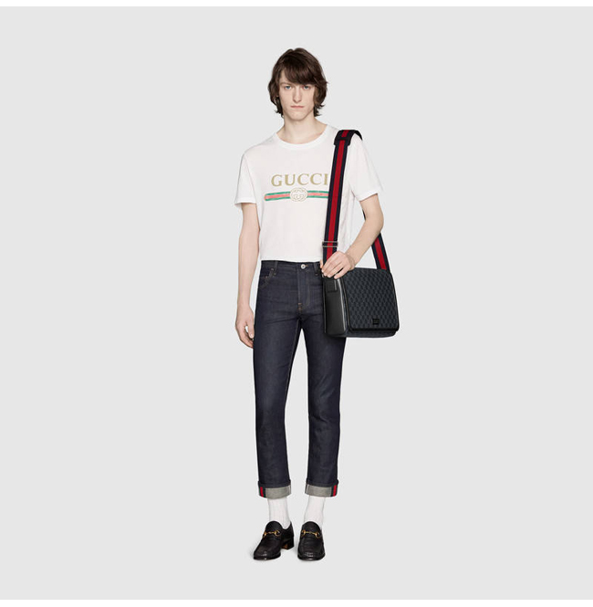 GG 모티프는 웹 스트랩과 블랙가죽 트리밍으로 더 풍부해졌습니다.