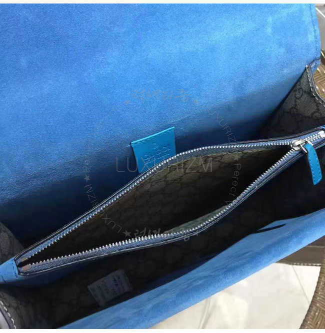GG 수프림 캔버스. 친환경 소재 리아트 블루 스웨이드 디테일 숄더