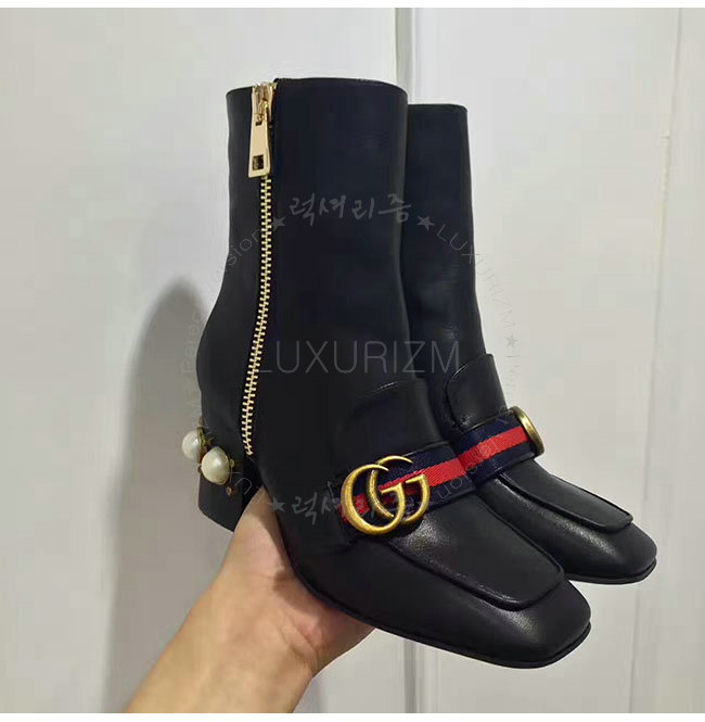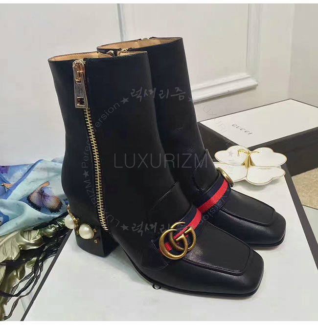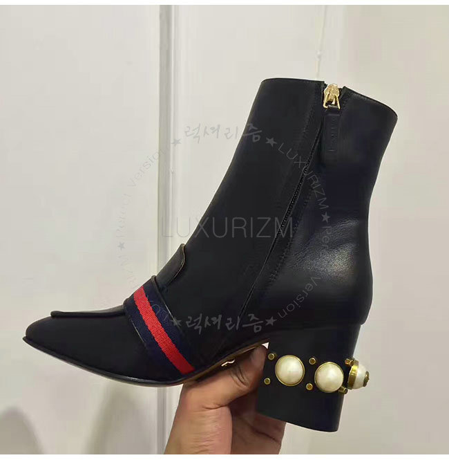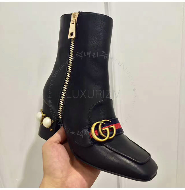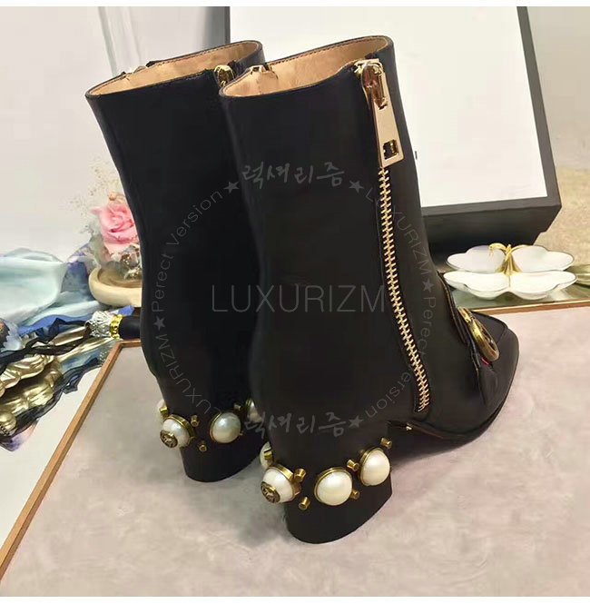 GUCCI-432060 1061 구찌 블랙 가죽 글라스 펄 미드힐 앵클 부츠 여성용