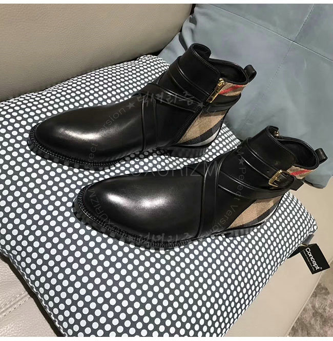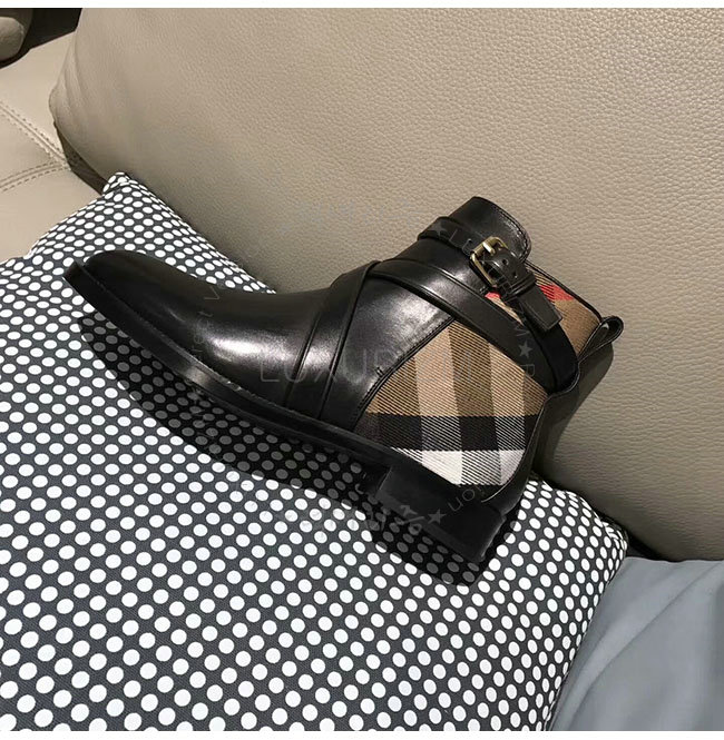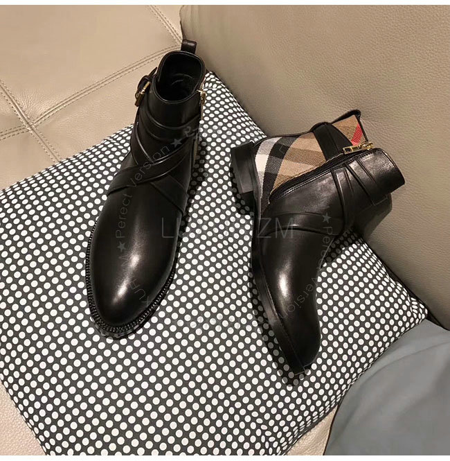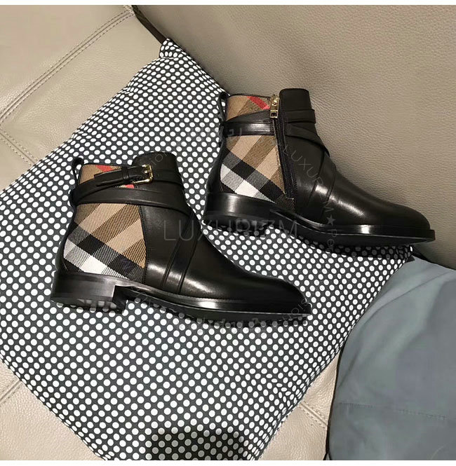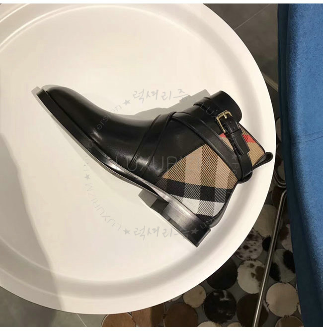 [스페셜오더]BURBERRYI-40364781 버버리 스트랩 디테일 하우스 체크 블랙 가죽 앵클 부츠