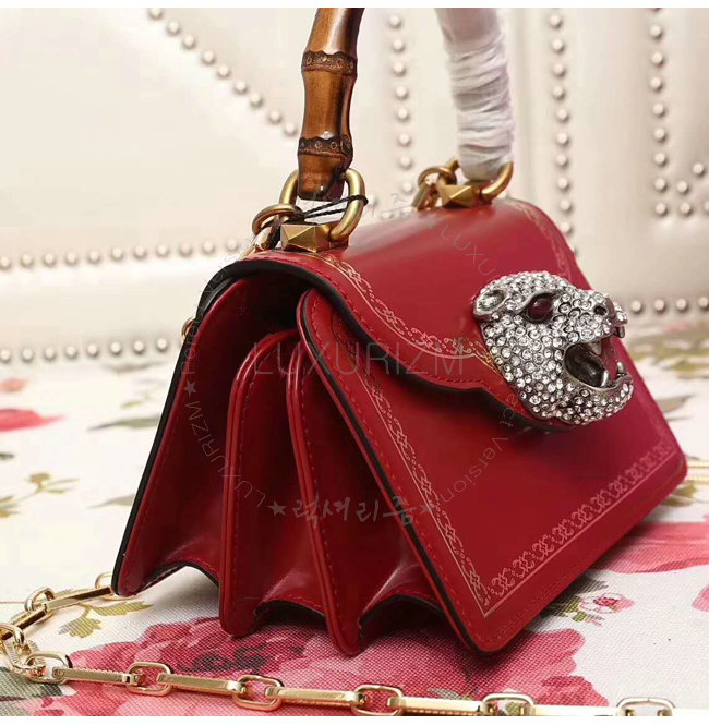 프레임. 아이코닉 뱀부 핸들 과 빛나는 크리스탈 및 눈 부분에 2개의 스톤이 장식 된 컬러