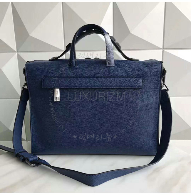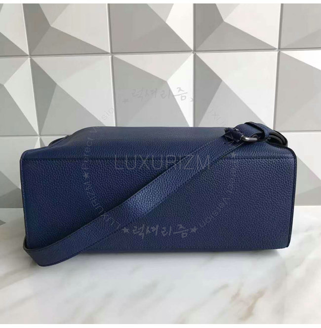 네이비 블루 컬러의 로만 가죽 직사각형 숄더백. 로우 엣지와 핸드 스티치 장식. 비대칭 핸들