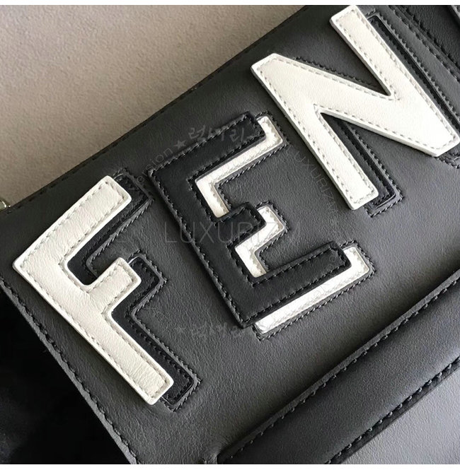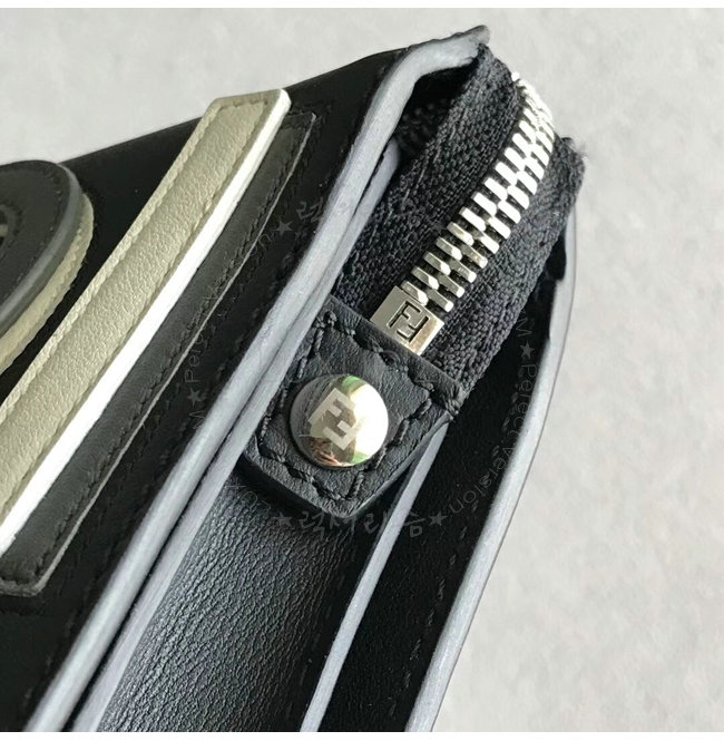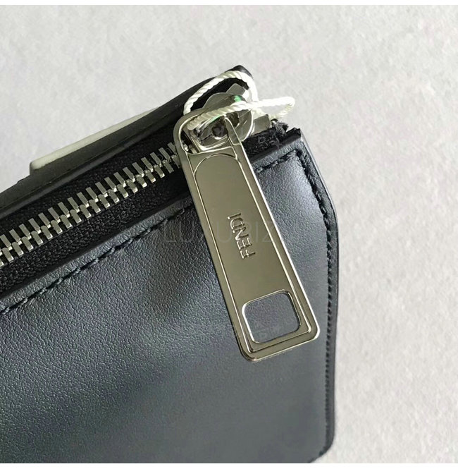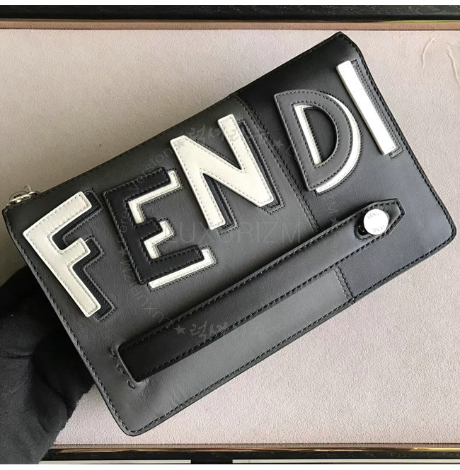 지퍼 포켓. 그레이와 블랙 컬러의 송아지 가죽 소재. FENDI 문구를 연출하는 블랙 화이트