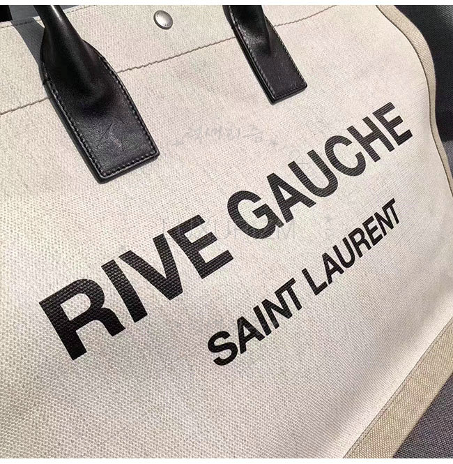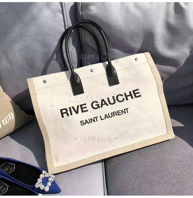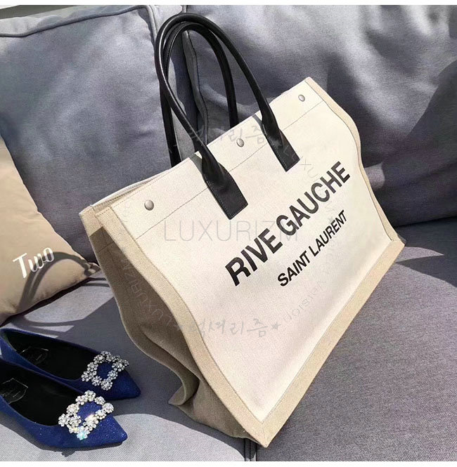 SAINT LAURENT-499290 생 로랑 베이지 린넨 코냑 가죽 브라운 손잡이 라이브 가우슈 토트백 가격 : 300,000원
