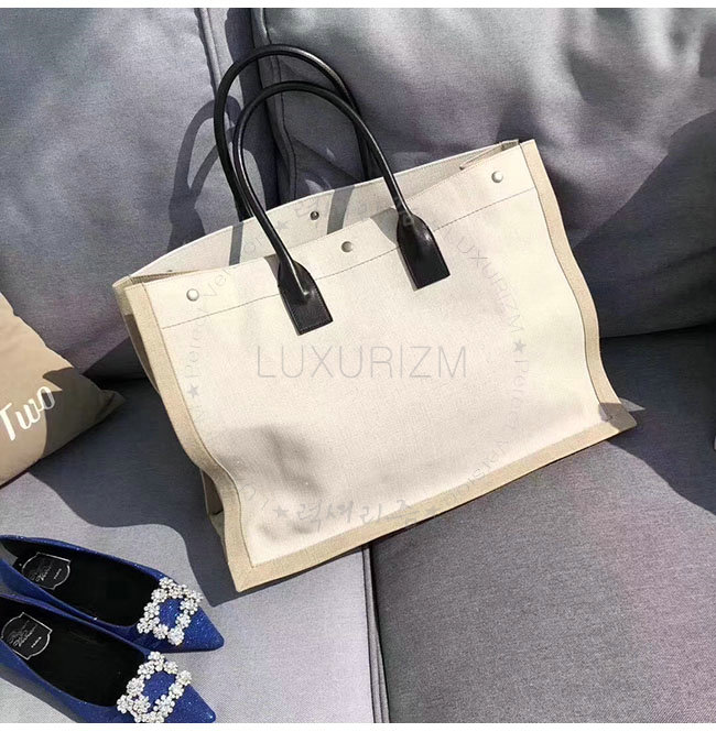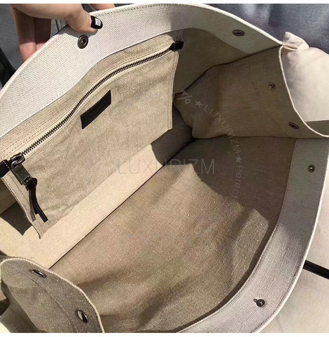 SAINT LAURENT-499290 생 로랑 베이지 린넨 코냑 가죽 블랙 손잡이 라이브 가우슈 토트백