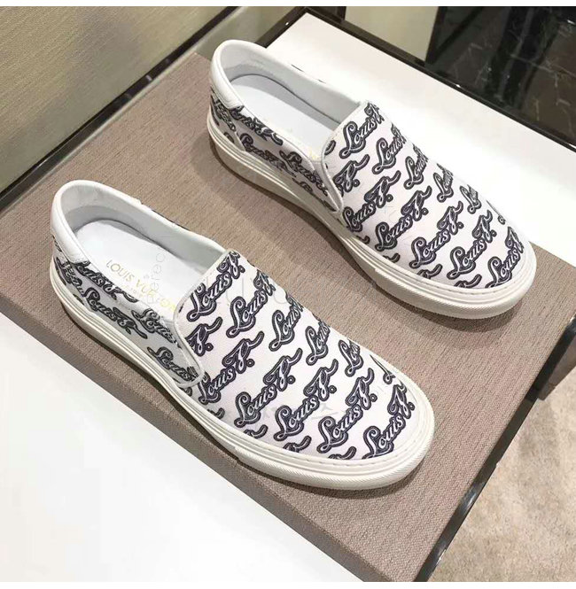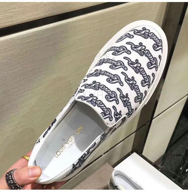 프린트를 더한 천과 루이 V 패턴 고무 밑창이 어우러진 슬립 온입니다.