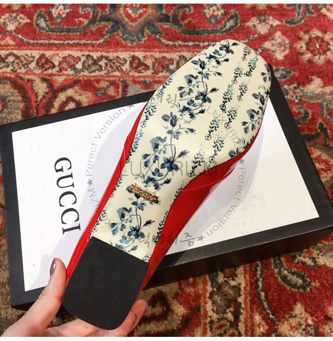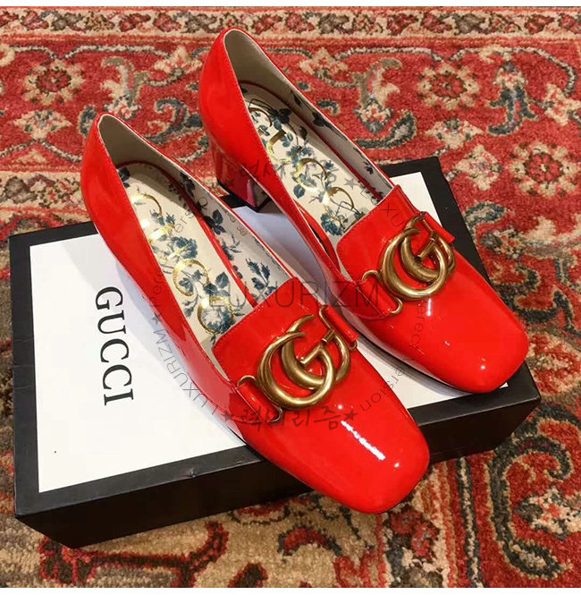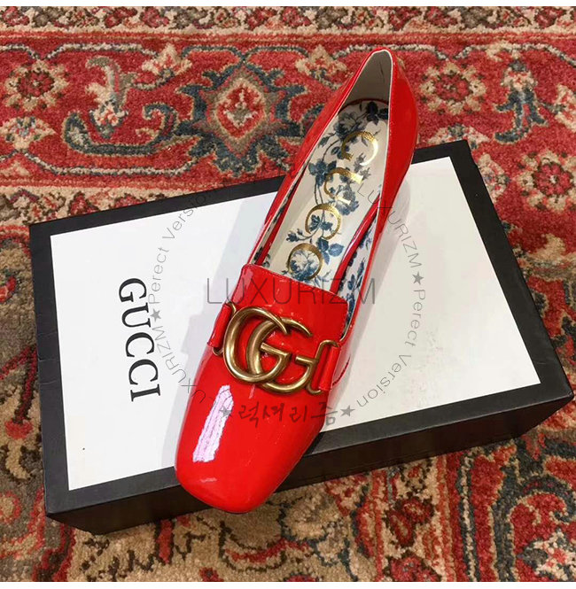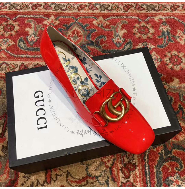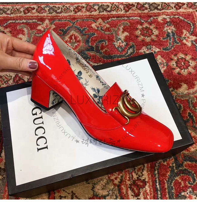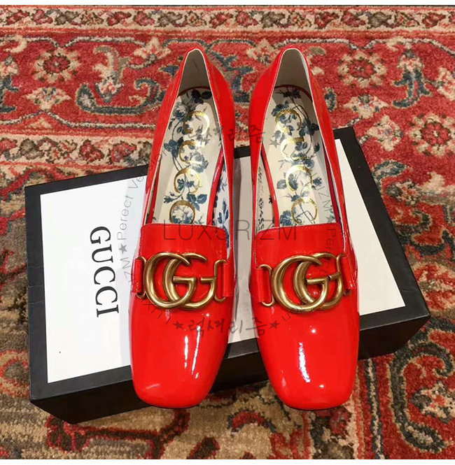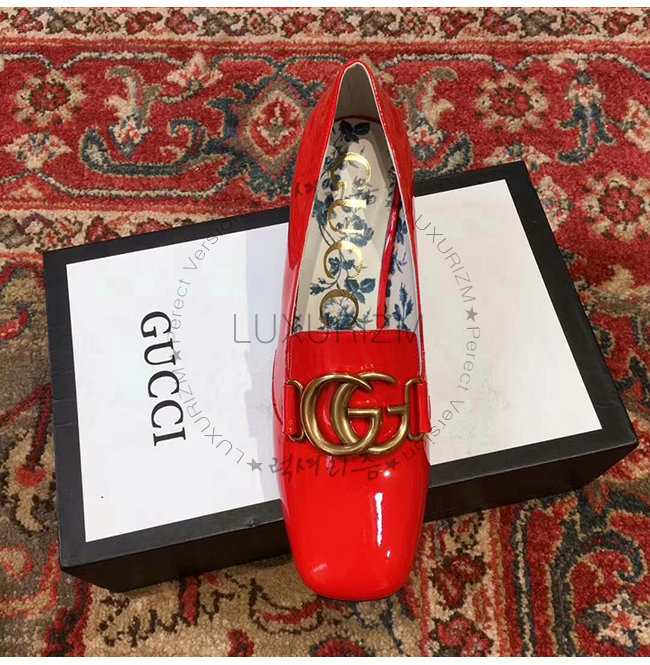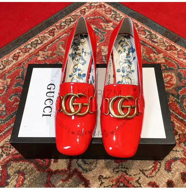 GUCCI-525333 6433 구찌 빅토아르 레드 페이턴트 가죽 더블 G 장식 미드힐 펌프스