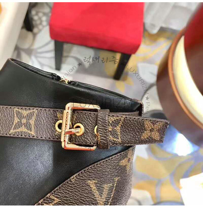 블랙 컬러의 부드러운 송아지 가죽과 아이코닉한 모노그램 캔버스의 대비가 돋보이는