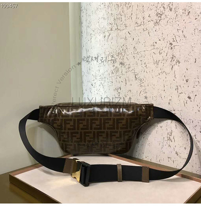 지퍼 잠금식 벨트 백. 길이 조절 가능한 웨빙 벨트. 글레이즈드 패브릭 소재. 브라운