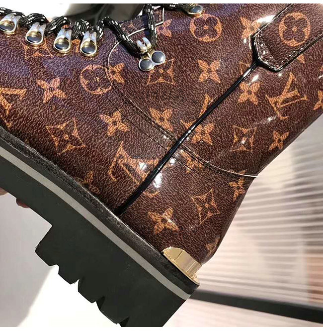 고광택의 모노그램 글레이즈 캔버스를 바탕으로 제작된 LV 아웃랜드 앵클 부츠는