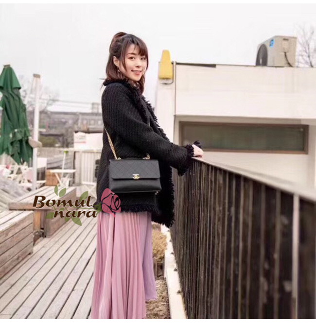 외관은 샤넬 트레이드 마크 다이아몬드 스티치 장식 마감.