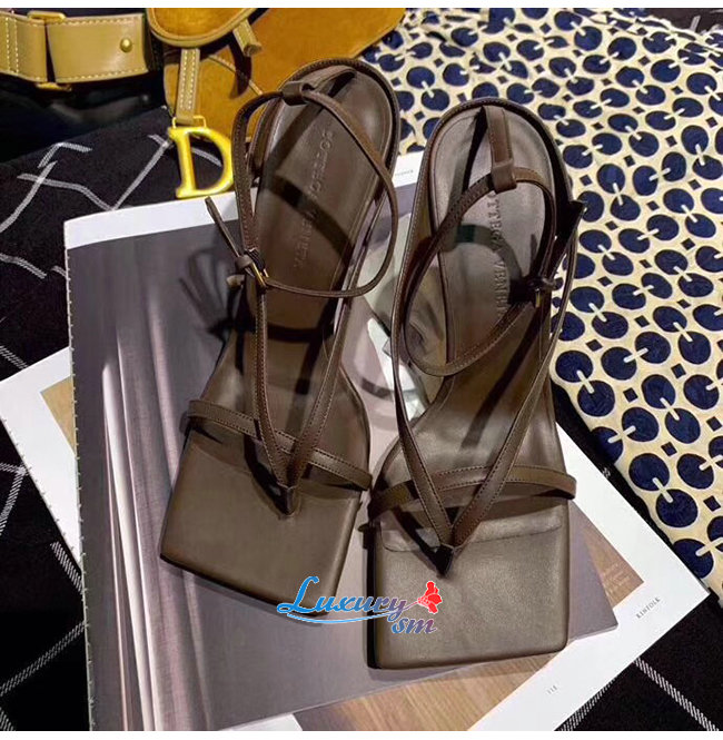 긴 사각 형 형태의 밑창이 돋보 이는 앵클 스트랩 샌들