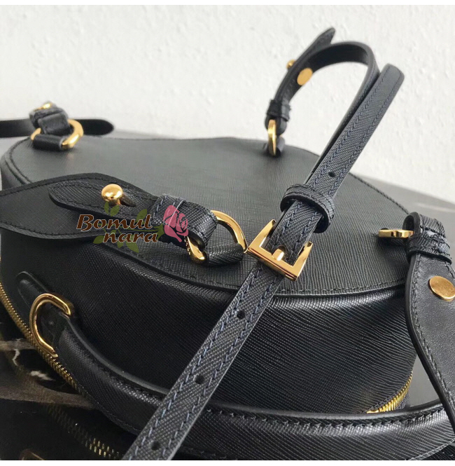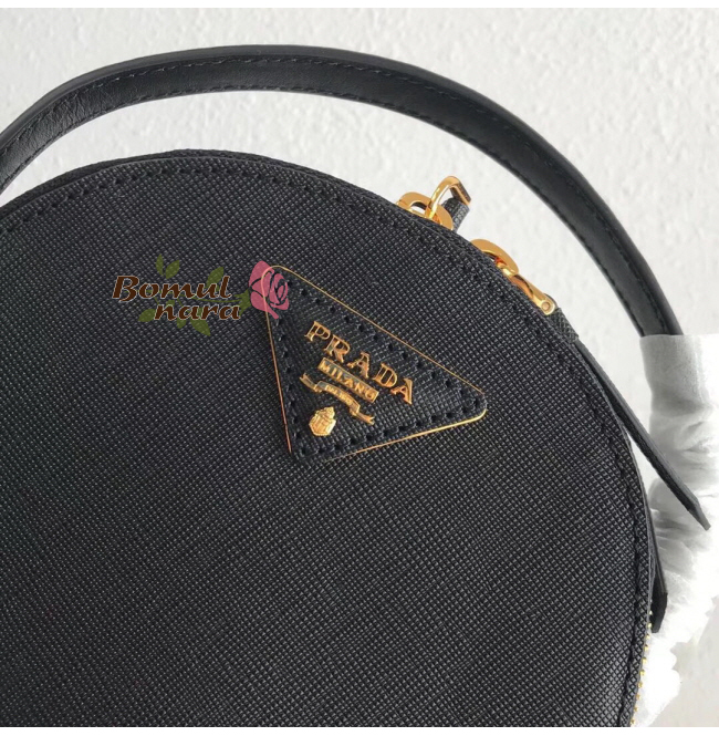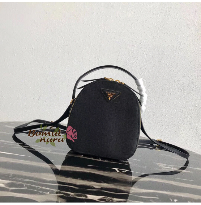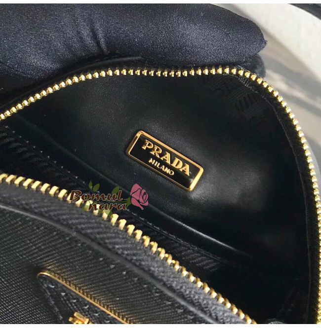 블랙 사피아노 가죽 텍스처가 멋스러운 프라다 삼각 로고.