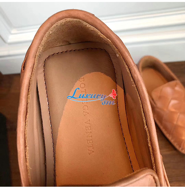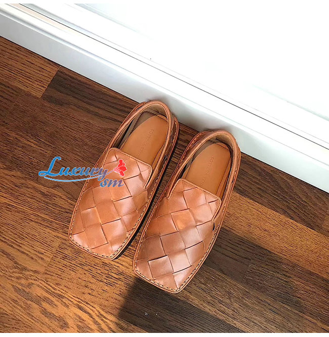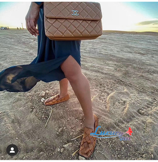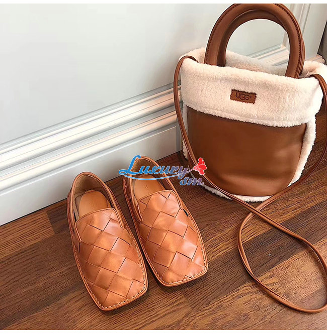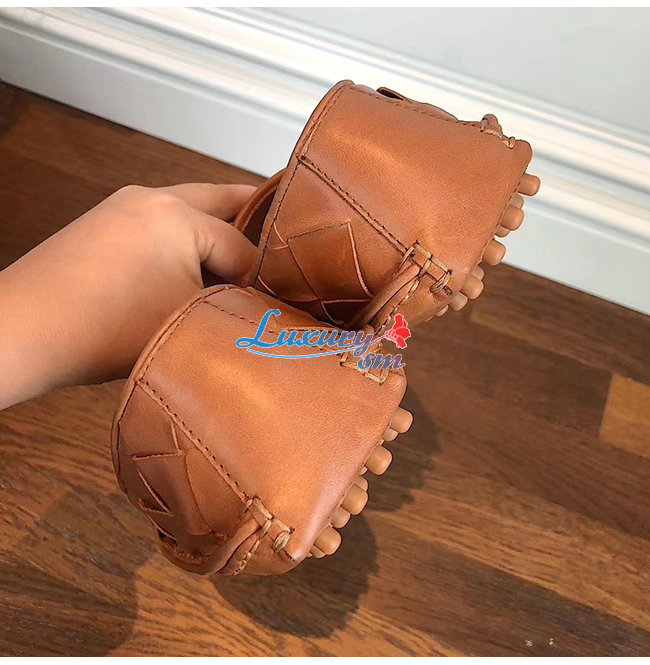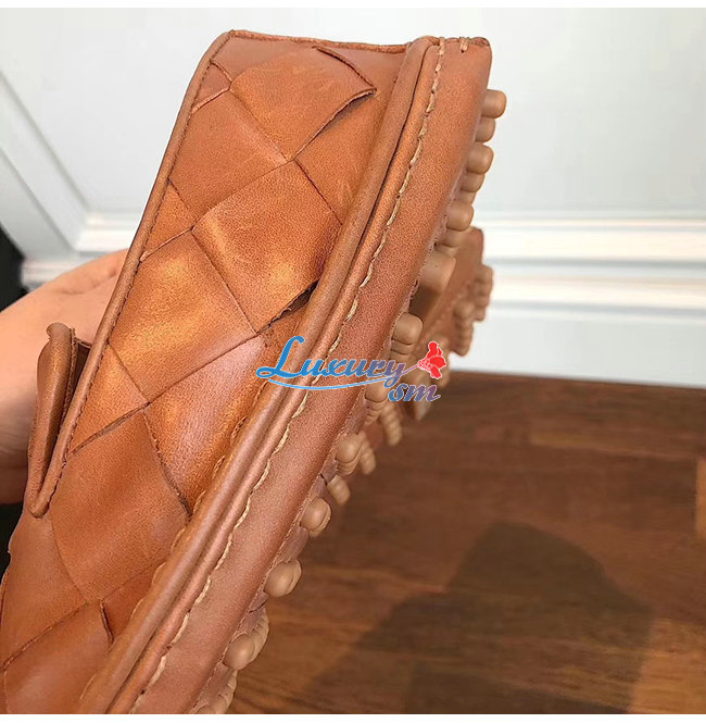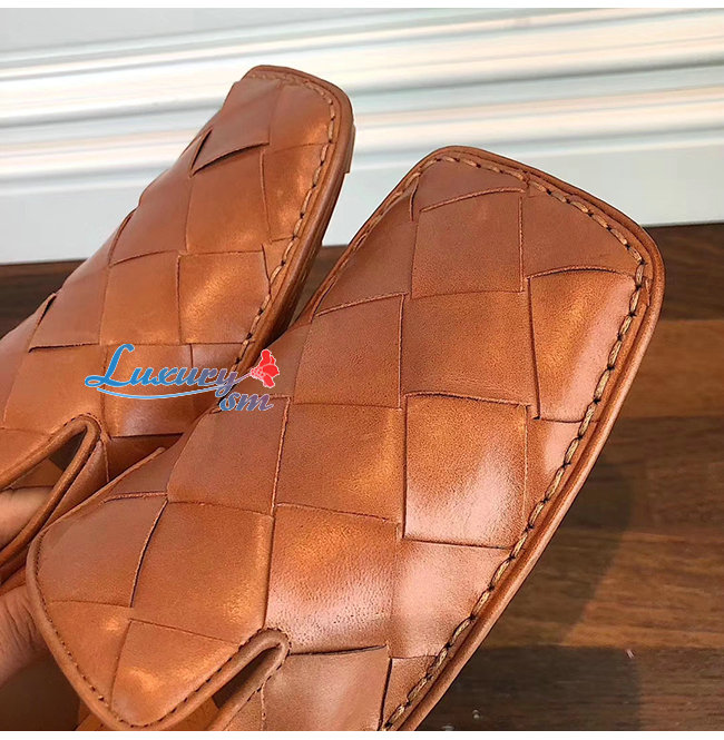 BOTTEGA VENETA-578309 보테가 베네타 라이트 캐러멜 송아지 가죽 인트레치아토 스퀘어 토 슬리퍼 여성용