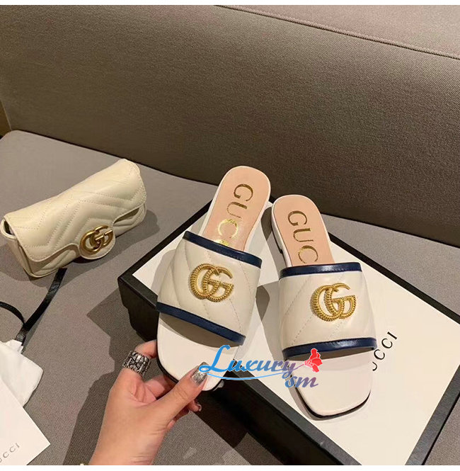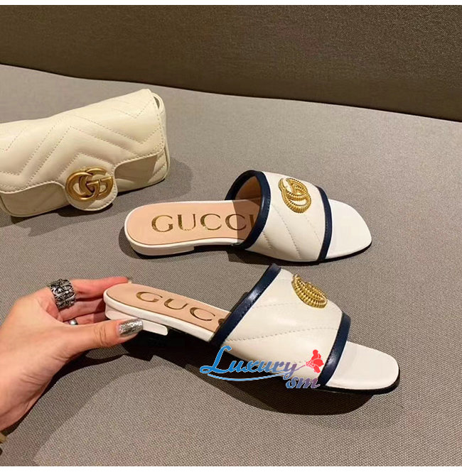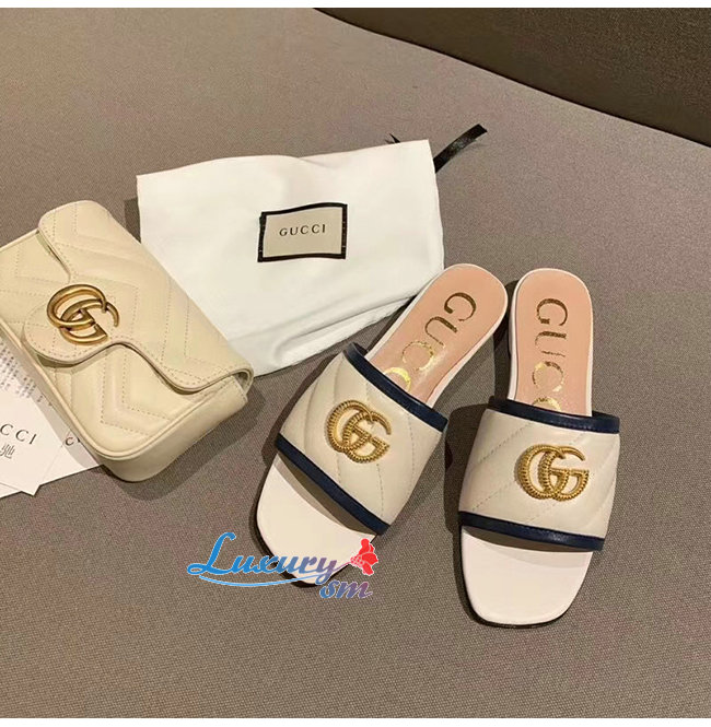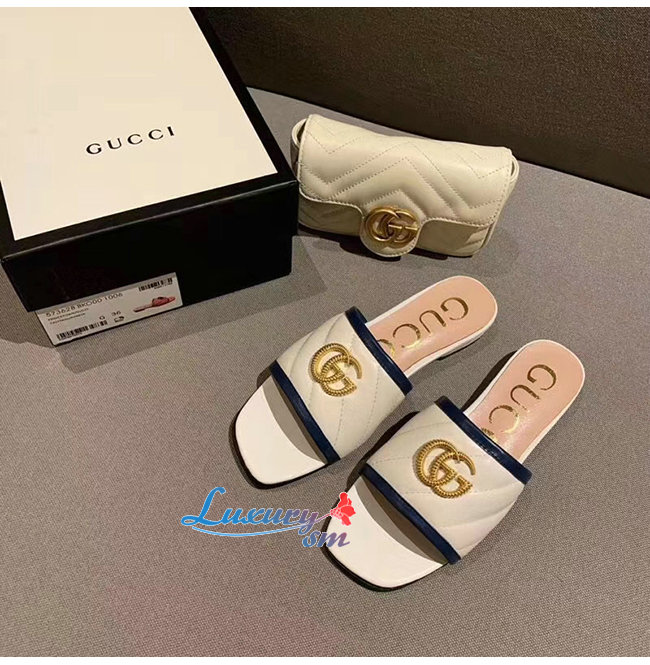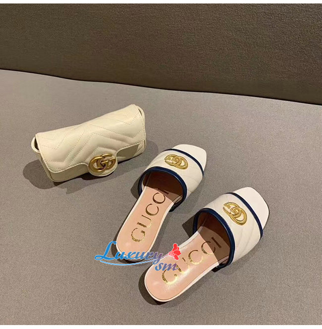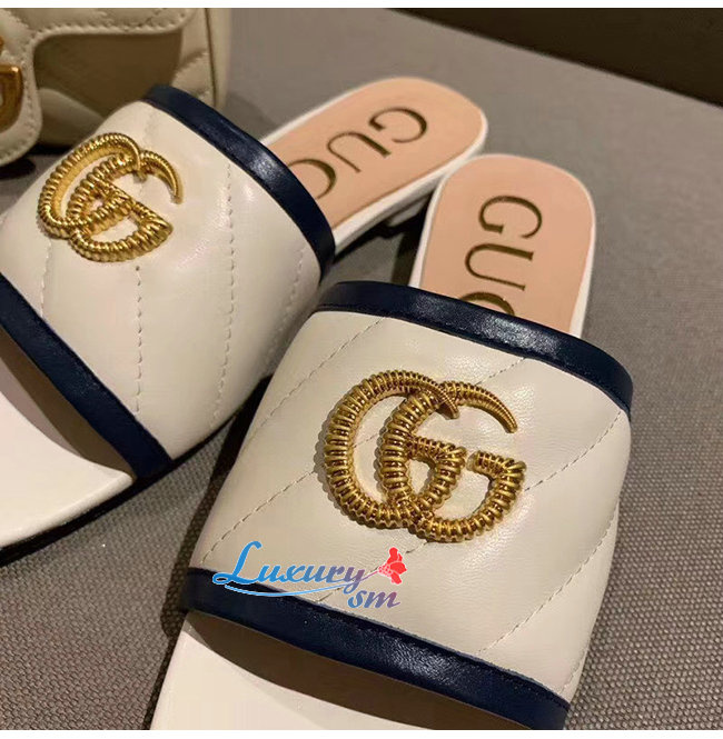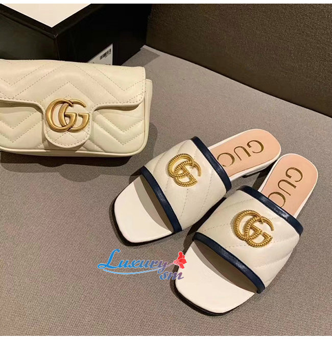 GUCCI-629730 4171 구찌 화이트 사선형 마틀라세 가죽 더블 G 장식 슬라이드