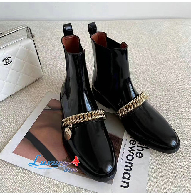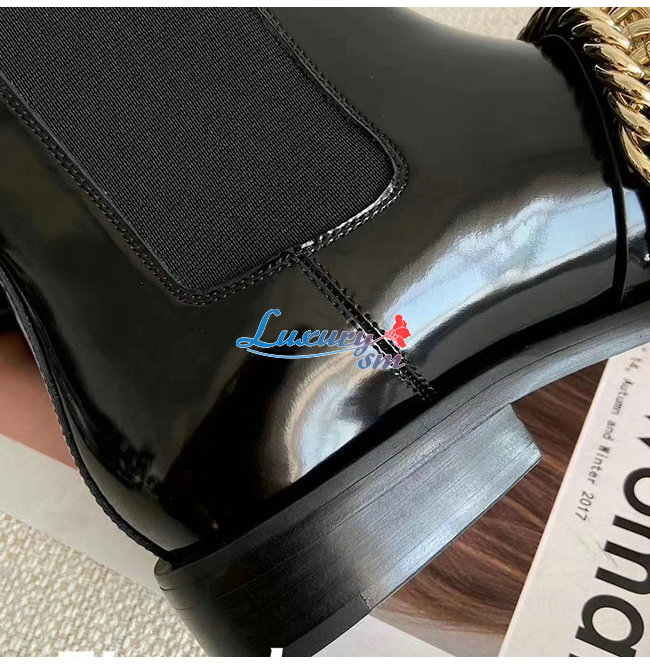유광 블랙 가죽 소재의 체인 첼시 부츠, 엘라스틱 거싯