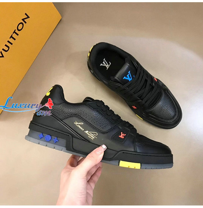 LOUIS VUITTON-1A8IJU 루이비통 블랙 글레이즈드 카프스킨 LV 트레이너 스니커즈