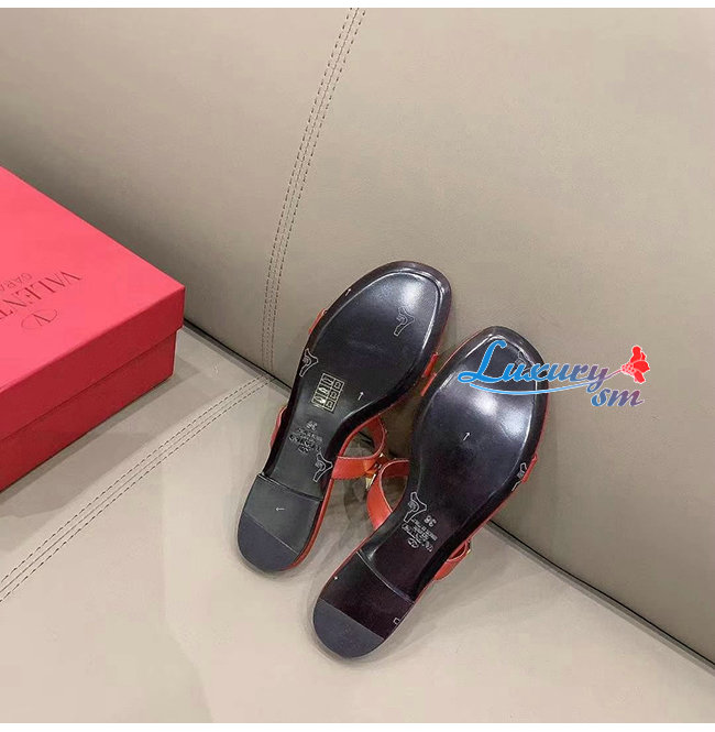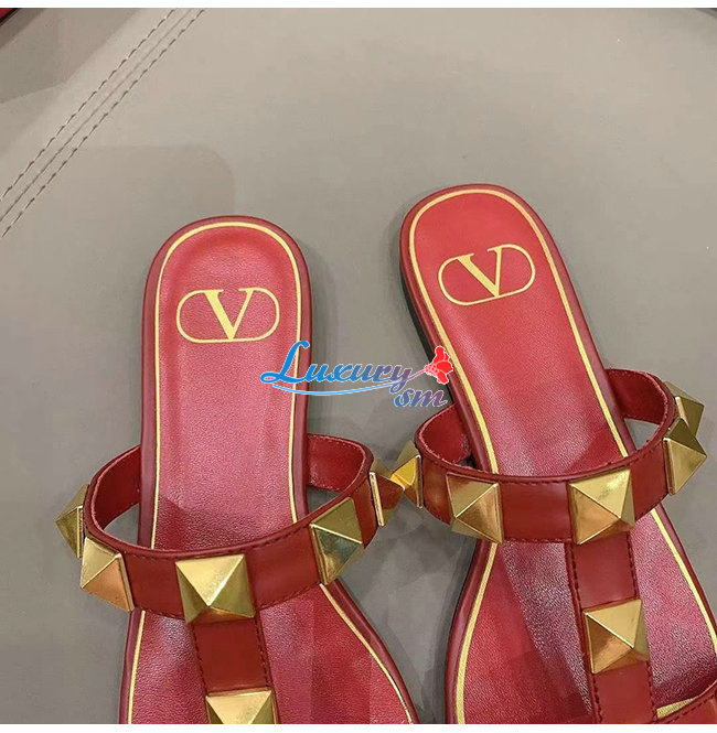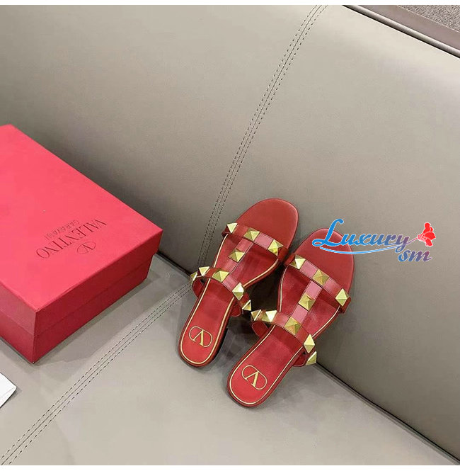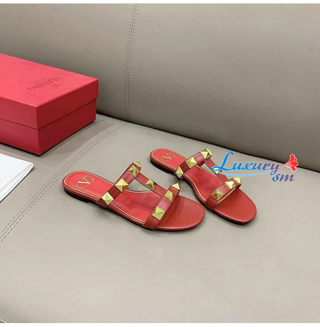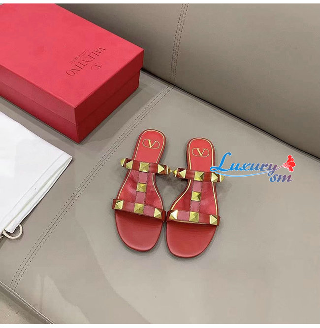 VALENTINO-VW0S0BU 발렌티노 로즈 송아지 가죽 ROMAN STUD 플랫 슬라이드 샌들 여성용