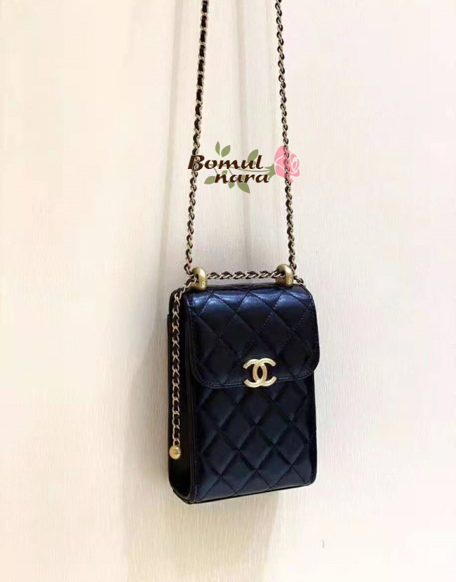 체인달린 미니백으로 체인 끝 샤넬각인이 새겨진