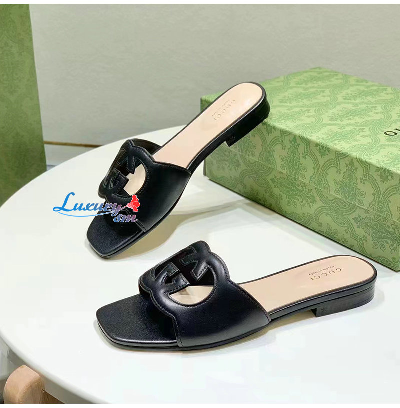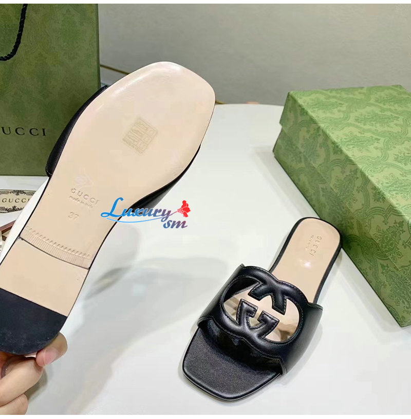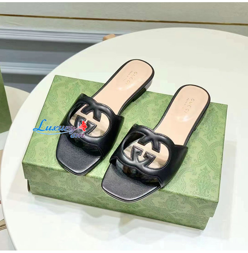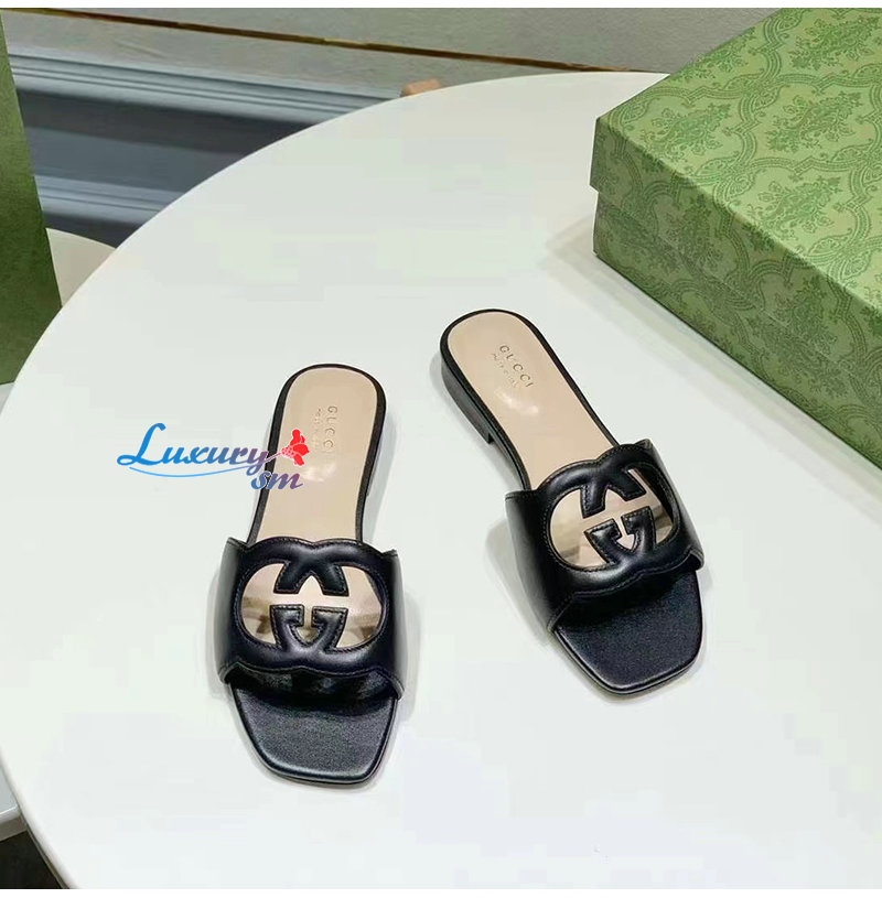 GUCCI-694451 1000 구찌 블랙 인터로킹 G 컷아웃 슬라이드 샌들 여성용