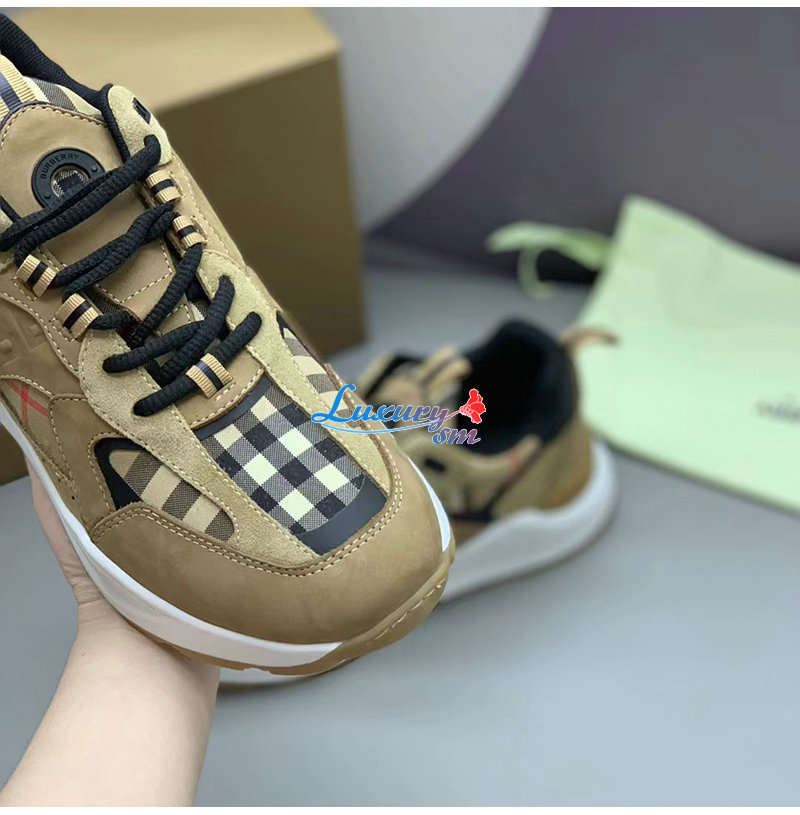 BURBERRY-80708511 버버리 베이지 체크 레더 스웨이드 스니커즈 남성용