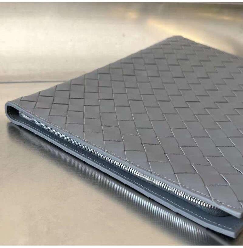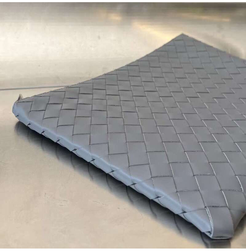 가죽 소재를 인트레치아토 위빙으로 완성한 파우치.