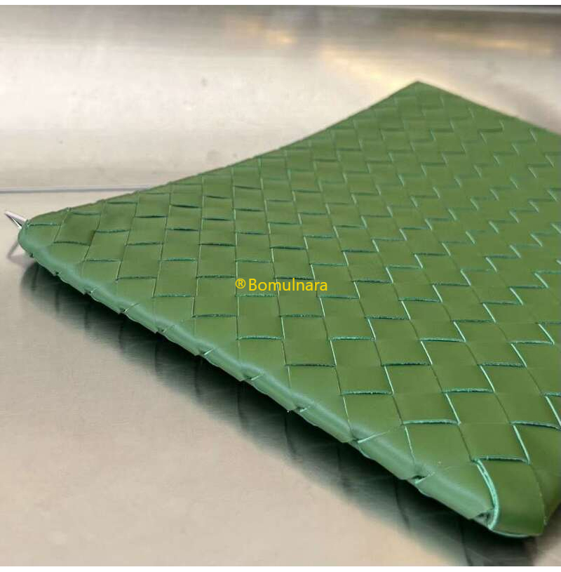 가죽 소재를 인트레치아토 위빙으로 완성한 파우치.