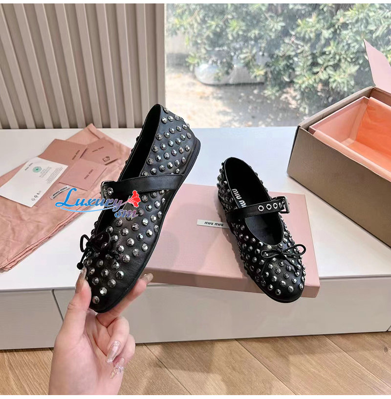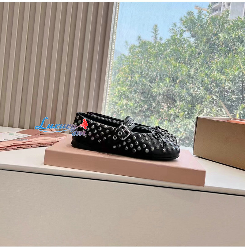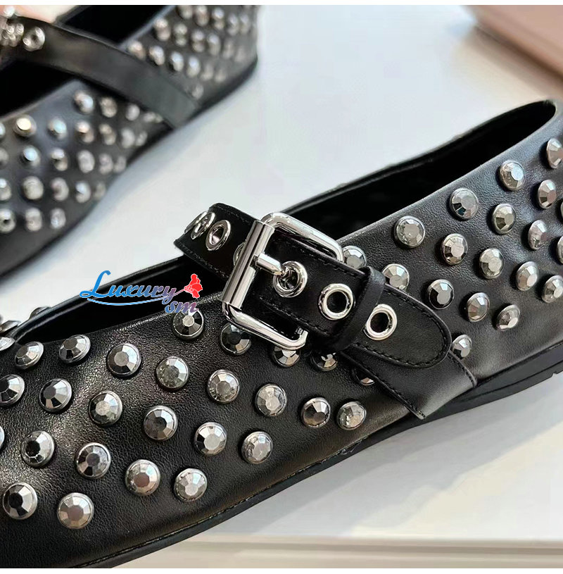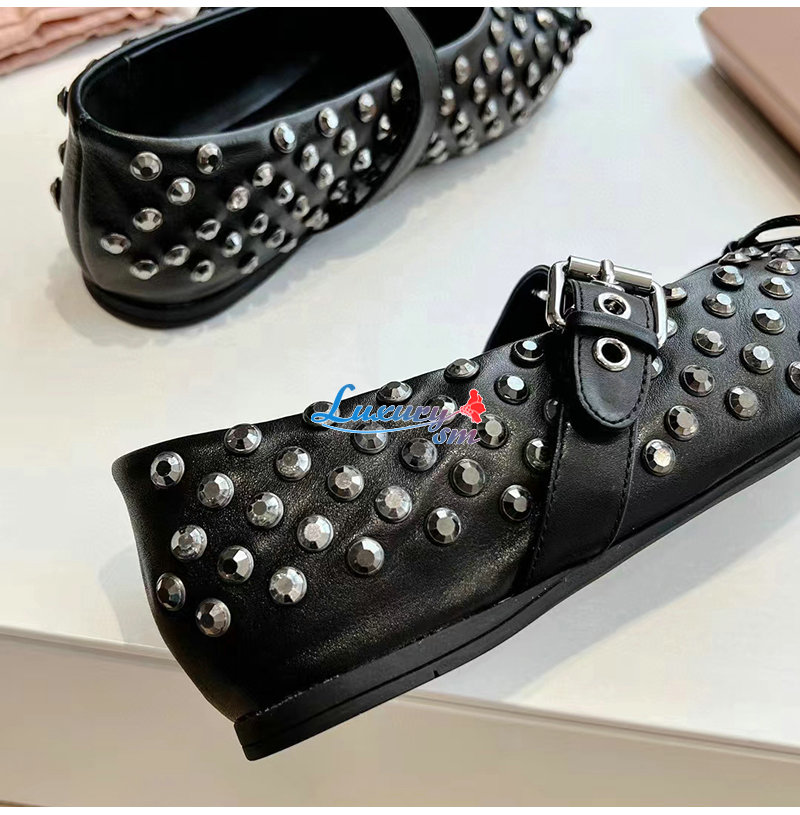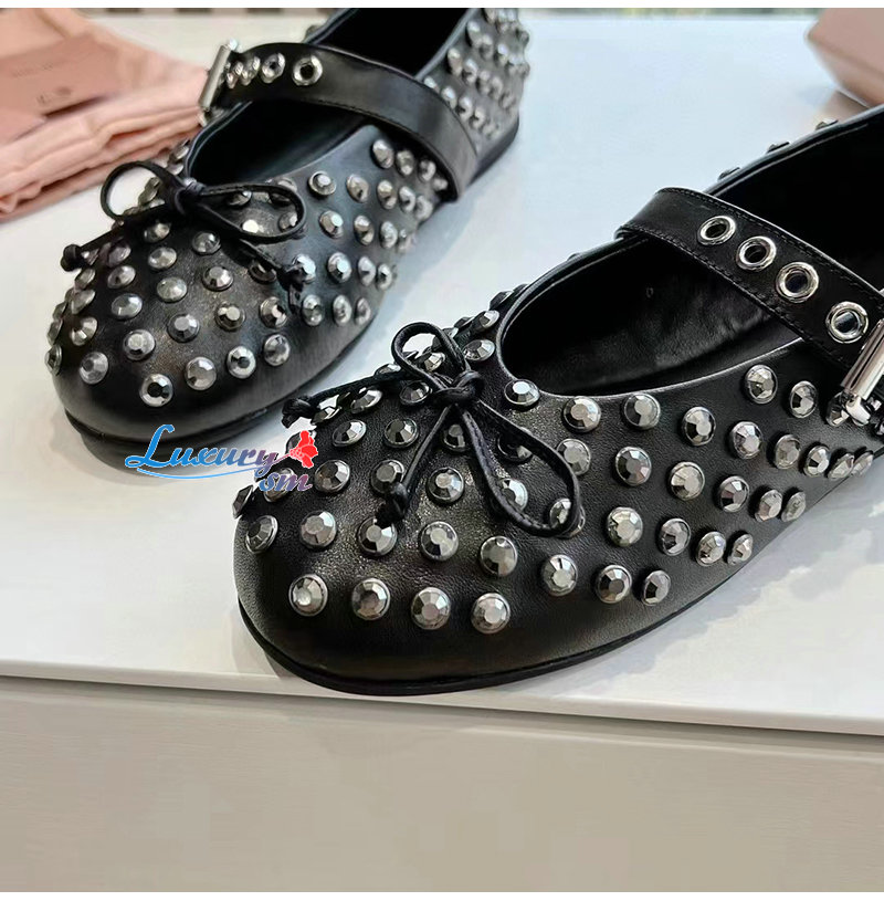 MIUMIU-5F212E 미우미우 블랙 가죽 크리스털 장식 발레리나