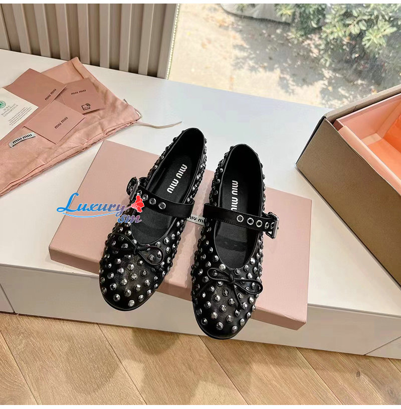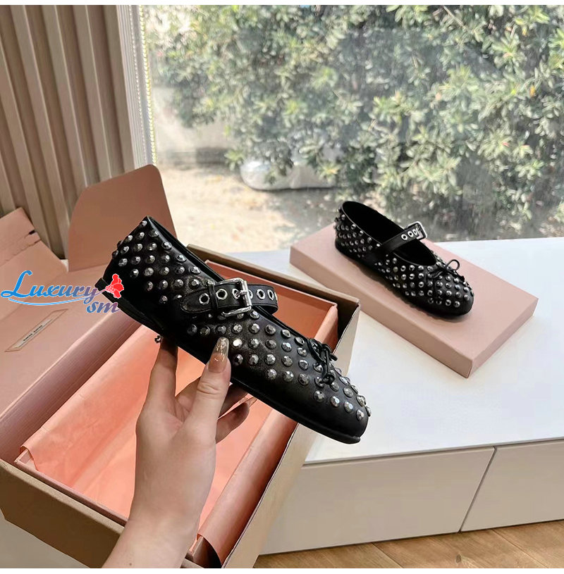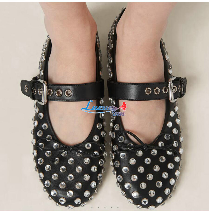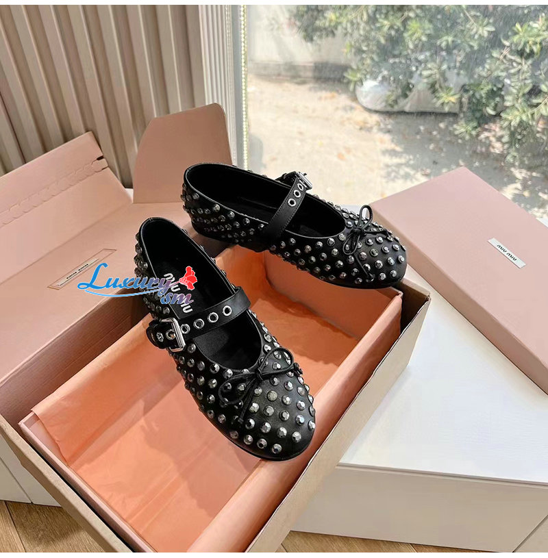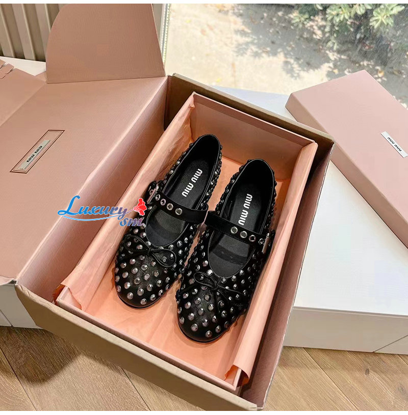MIUMIU-5F212E 미우미우 블랙 가죽 크리스털 장식 발레리나