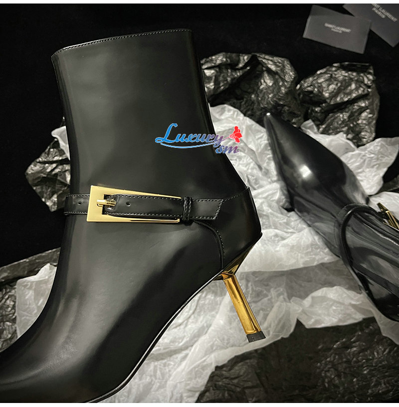 앵클 부츠. 포인티드 토, 기하학적인 골드 도금