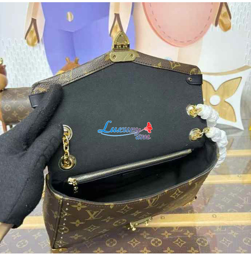 골드 색상 리벳이 장식된 모노그램캔버스 소재.